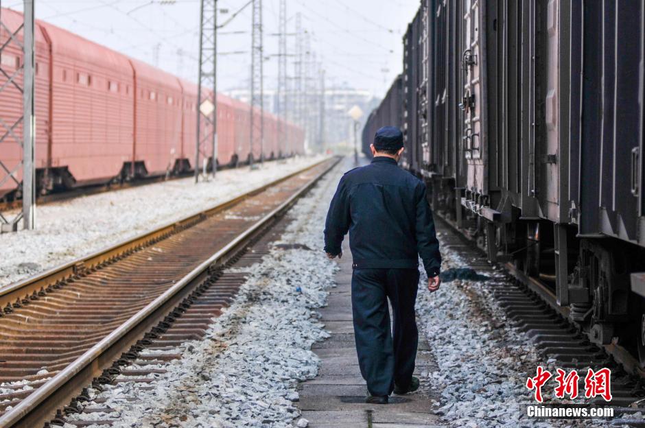 2月3日,在广西最大铁路货运枢纽柳州南编组站,穿着解放鞋的柳州铁路公安处南站派出所出发场警务站民警刘克强穿梭在列车之间,巡查列车与线路的安全。不论风雨寒暑,他每次值班都要步行巡查责任区域,路程至少有14公里,检查150辆左右的进出场列车。