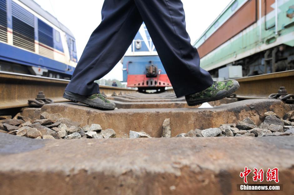 穿着解放鞋的刘克强走过铁道。黄威铭 摄