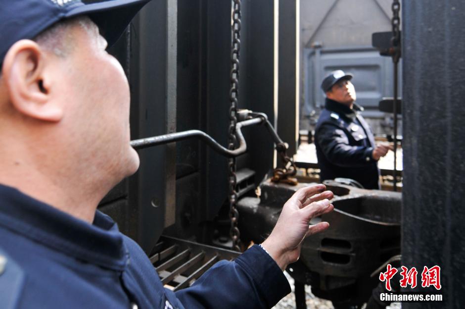 刘克强和辅警一起检查车厢上篷布的固定情况。他的手十分粗糙,他说他们每一个在场站工作的铁路警察,没有一个是细皮嫩肉的。黄威铭 摄