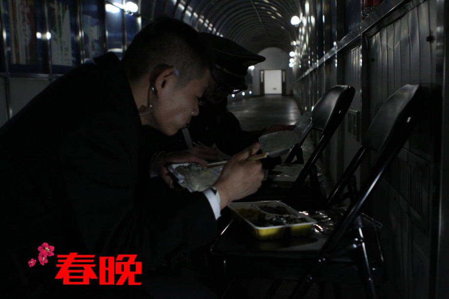 当舞台的光暗去,还沉浸在晚会精彩表演的你们,是否注意到在这光鲜靓丽的背后,还有许多工作人员在忙碌?春晚是许多人共同努力的劳动成果,虽然幕后工作人员的兢兢业业,不是一张张图片所能表达的,但小编更愿意用镜头去记录下每一个发光发热的瞬间,因为正是有了这样的辛勤和坚守,整场演出的品质才得以保证。小编相信,还有许许多多的人为春晚付出了努力。在这里,真诚向所有春晚幕后工作人员说一声:辛苦了,谢谢!图为7日晚,保障春晚安全的警卫人员正在演播区旁边的走廊里吃着他们的“年夜饭”。