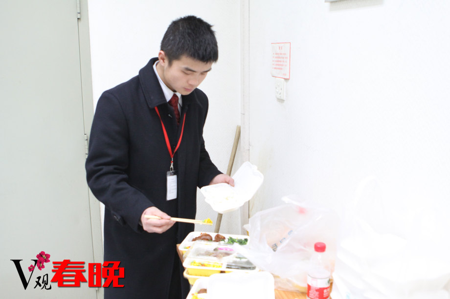 图为7日晚,保障春晚安全的警卫人员正在演播区旁边的走廊里吃着他们的“年夜饭”。