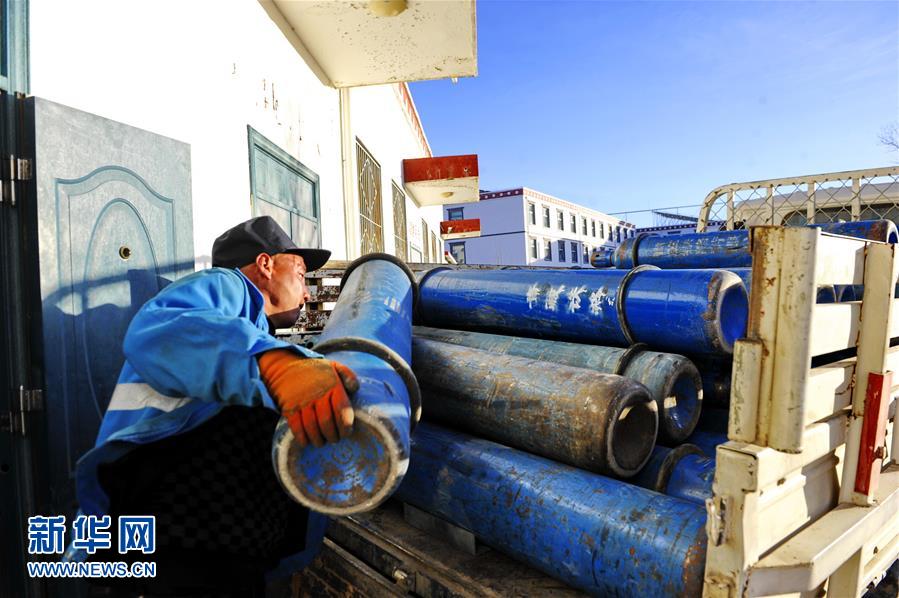 青海青藏铁路劳动服务公司拉萨综合车间的送氧工李永国在送氧车上装载瓶装氧气,准备送往青藏铁路沿线站点(2月5日摄)。新华社记者张汝锋摄