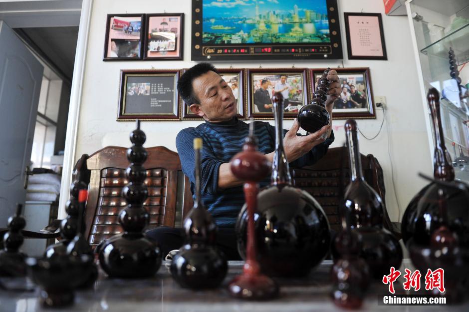 高世俊制作的东西叫“琉璃圪嘣”,因吹动时发出“圪嘣、圪嘣”的声音得名。从明清以来,琉璃圪嘣是汉族地区春节流行的一种特殊音乐玩具,曾随晋商活动在中国各地广为流传。 中新社记者 韦亮 摄