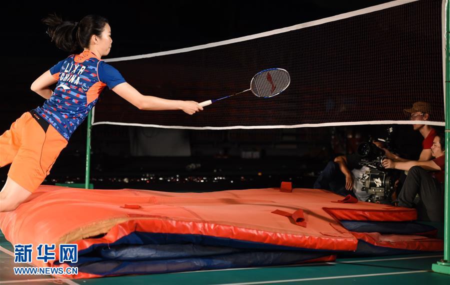 2月21日,李雪芮为“羽林争霸”拍宣传片时鱼跃救球。新华社记者刘大伟摄