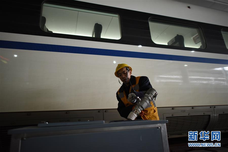 2月22日,一名队员在为动车组吸污。在高铁贵阳北站,每当动车组停下就有一群身穿黄色工作服的给水吸污员飞快地奔走在各个站台股道间,为动车组提供用水、处理厕所污物。正是这些工作人员的辛勤劳动换来了乘客舒适、方便的旅行空间。新华社记者 刘续 摄