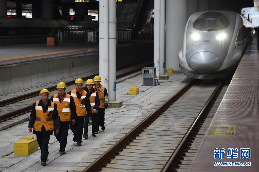 2月22日,给水吸污队员们穿梭在股道间。在高铁贵阳北站,每当动车组停下就有一群身穿黄色工作服的给水吸污员飞快地奔走在各个站台股道间,为动车组提供用水、处理厕所污物。正是这些工作人员的辛勤劳动换来了乘客舒适、方便的旅行空间。新华社记者 刘续 摄