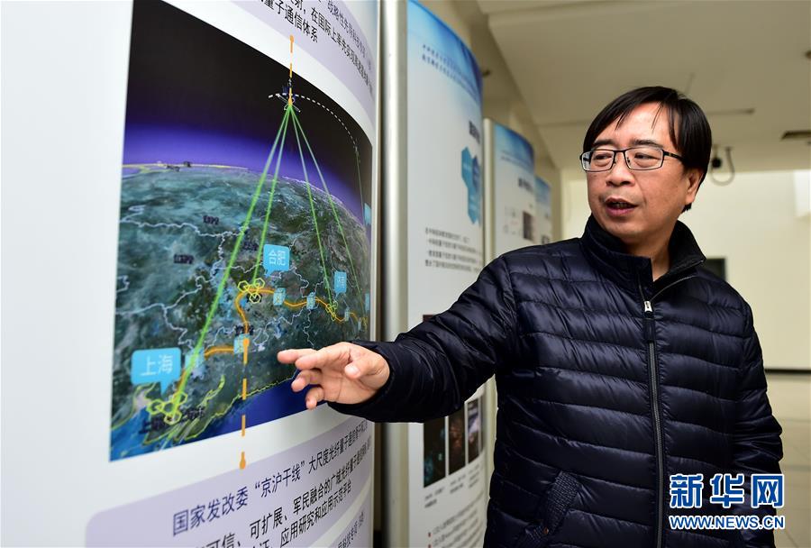 2月25日,潘建伟在中国科学技术大学实验室外介绍科研情况。2016年全国两会开幕在即,第十二届全国政协委员、中国科学院院士潘建伟忙着调研,补充完善关于科技领域的提案。2015年,以中国科技大学“70后”院士潘建伟为“领头羊”的“多光子纠缠及干涉度量”团队,将2015年度国家自然科学奖一等奖“收入囊中”。今年两会期间,潘建伟将就科技创新、科技成果转化、量子通信产业化、基础科研、垃圾分类等方面提出建议。新华社记者刘军喜摄