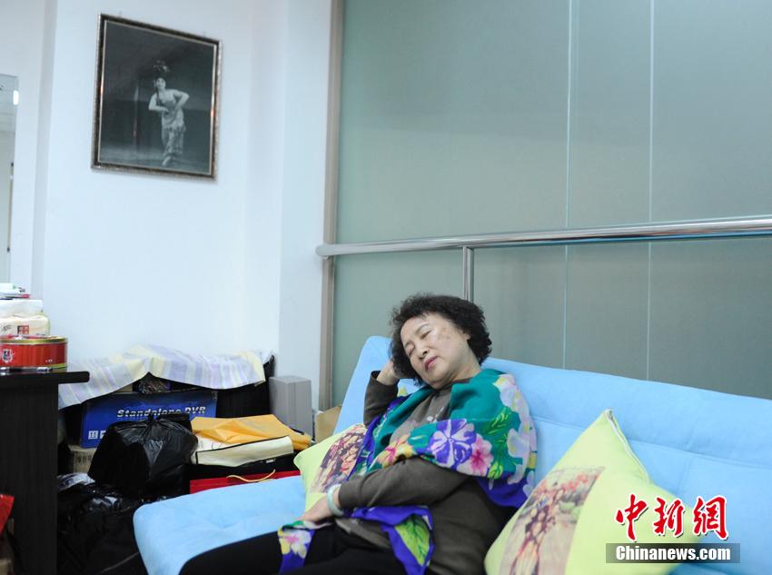 陈香兰在办公室的沙发上简单休息,墙上是她年轻时演出的照片,身旁是她已毕业学生送给她的毕业礼物。 张瑶 摄