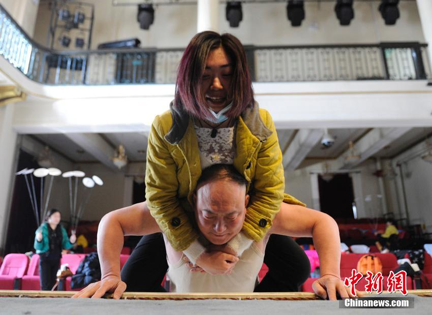 张辉在训练时让团员趴在他的身上做俯卧撑,加大运动量,严格要求自己。 张瑶 摄
