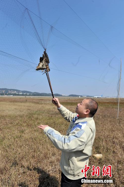3月2日,福州长乐机场驱鸟队的队员商煜斌和邵文礼驾驶着驱鸟车,在机场的驱鸟区域开始了巡逻工作。每天他们都是24小时不定时巡逻,确保航班安全。图为队员邵文礼正在处理被网住的丘鹬。邵文礼告诉记者,机场四周都有防护网,每个地区的防护网网住的鸟儿种类不一样,这样可以根据某个地点常出现的鸟儿制定驱鸟计划。吕明 摄
