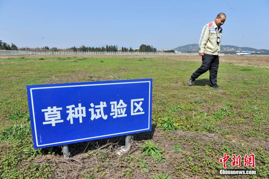 3月2日,福州长乐机场驱鸟队的队员商煜斌和邵文礼驾驶着驱鸟车,在机场的驱鸟区域开始了巡逻工作。每天他们都是24小时不定时巡逻,确保航班安全。图为邵文礼在查看草种试验区。草种试验区是为了以后让机场的草坪单一化,使得虫儿的种类单一化,从而改变鸟儿的栖息地,可以有效的减少鸟儿的数量。吕明 摄