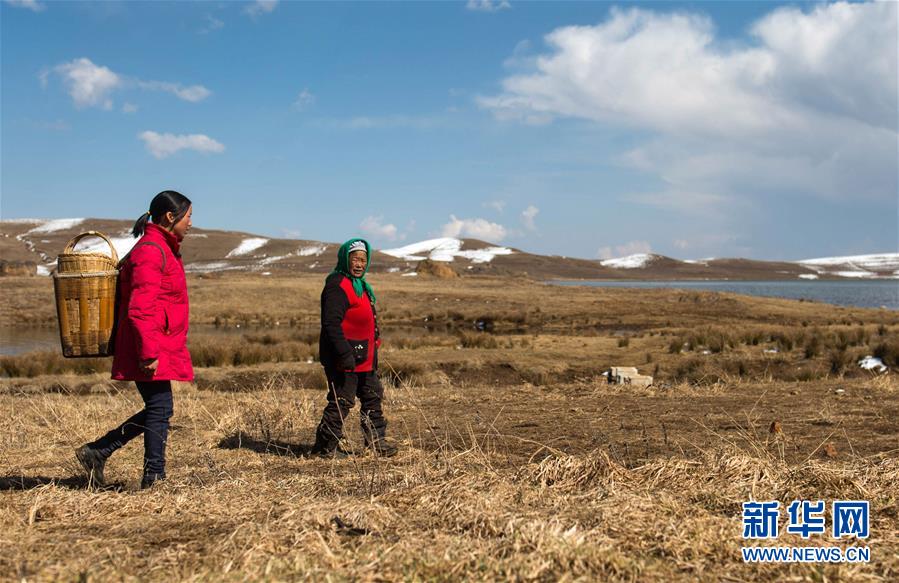 董应兰和陈光会背着粮食前往大海子湿地给黑颈鹤投食(2月28日摄)。