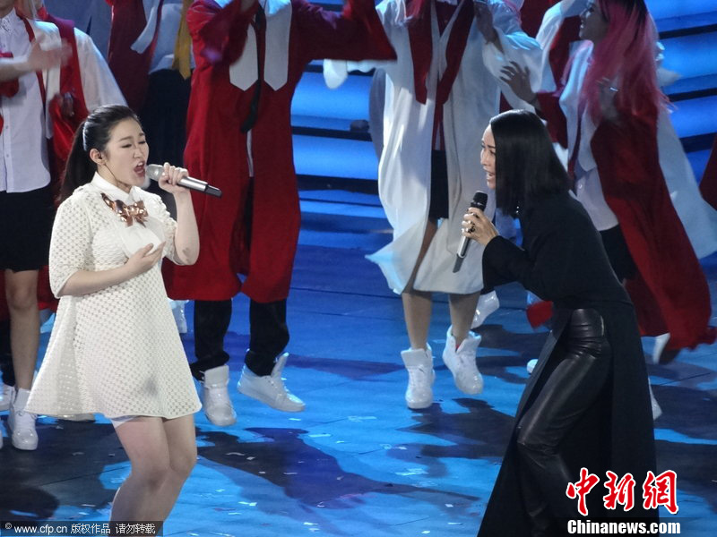2013年10月07日讯,上海,7日,《中国好声音》第二季总决赛。李琦、张恒远、萱萱、金润吉火力全开。经过三轮的比拼和较量,继续实验之旅的金润吉在演唱一首小清新的《遇见》后,首轮遭到淘汰。在终极对决中,“蘑菇头”李琦战胜张恒远,赢得观众支持率和媒体投票的“双高”,如愿获得年度总冠军,“新人”张惠妹也随之成为新科冠军导师,激动上台拥抱爱徒。钟福宝 摄