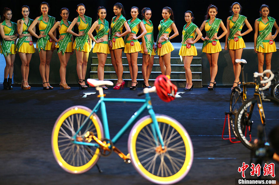 10月12日,在南京国际博览中心举办的2013亚洲自行车展上,以倡导“低碳、环保”的生活理念、展示“青春、活力、时尚”生活风尚的自行车小姐大赛上演总决赛,二十位青春靓丽的选手经过现场的激情展示,最终决出冠亚季军。图为参赛选手精彩亮相。泱波 摄