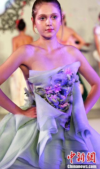 10月20日晚,一场婚纱秀在北京举行,设计师作品以“陌上花开”为主题,分别以荷花、梅花、桃花、睡莲等为灵感,融入时代传承的苏秀精华,在其轻盈、性感、女神范后又增加了文化传承。图为模特进行展示。中新社发 钱兴强 摄