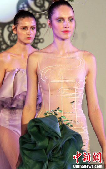 10月20日晚,一场婚纱秀在北京举行,设计师作品以“陌上花开”为主题,分别以荷花、梅花、桃花、睡莲等为灵感,融入时代传承的苏秀精华,在其轻盈、性感、女神范后又增加了文化传承。图为模特进行展示。中新社发 钱兴强 摄