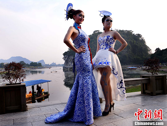 10月26日,广西桂林大学生在桂林著名象山景区举办“中国梦”大学生时装模特秀,展示他们的优秀毕业作品。充满中国传统元素和现代时尚元素的服饰展示,吸引了上千名市民、中外游客和摄影爱好者观赏、拍摄。