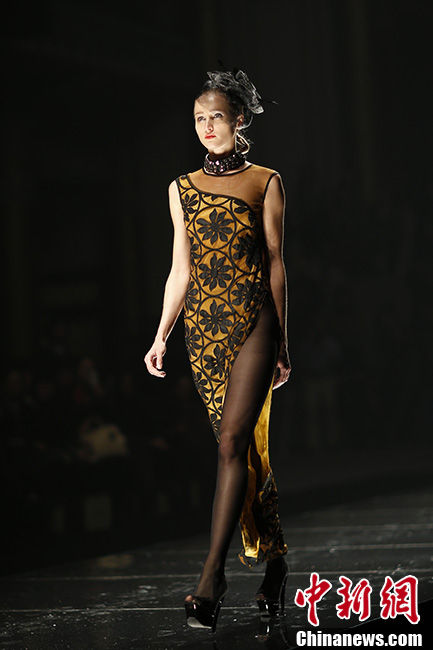 10月28日,模特在中国国际时装周(2014春夏系列)上展示设计师谢家齐设计的时装。当日,K.G. S·谢家齐时装发布会在北京举行,欧洲英伦风尚与古典贵族气息相结合,突出雅致、精美、特有的时尚、优雅与浪漫。中新社发 盛佳鹏 摄