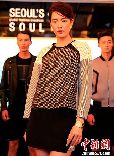 11月6日,来自韩国首尔十个新锐时装品牌集结上海,展示其2014年春夏系列,希望在上海这个时尚之都获得认可。潘索菲 摄