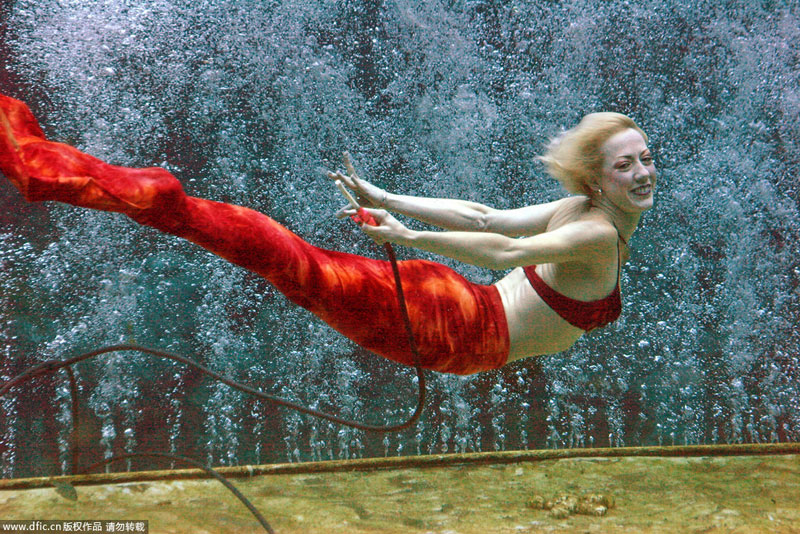 当地时间2013年11月18日报道,美国佛罗里达州的Weeki Wachee Springs State Park于近日开设了水下剧场,并邀请女演员们穿上比基尼和美人鱼制服参加表演。结果这一真人美人鱼的企划大受欢迎,据项目主管所说,部分原因是人们长久以来对美人鱼本身的憧憬,还有部分原因是出于演员们的卓越技巧:她们在水中舞动的姿态轻盈曼妙,仿佛天生就是水底居民。