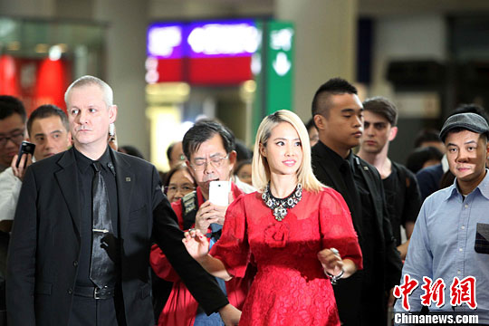 11月26日,台湾歌手蔡依林莅临香港机场出席奥地利水晶圣诞树揭幕活动,在多名保镖簇拥下进场。当天,时尚品牌Swarovski为香港国际机场打造闪亮圣诞树,举行盛大开幕仪式。中新社发 洪少葵 摄