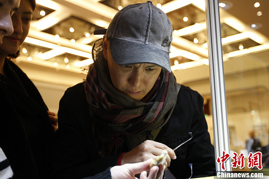 12月5日,台湾情歌王子张信哲在北京古天一2013秋季拍卖会上查看预展拍卖的文物艺术品。中新社发 杨可佳 摄