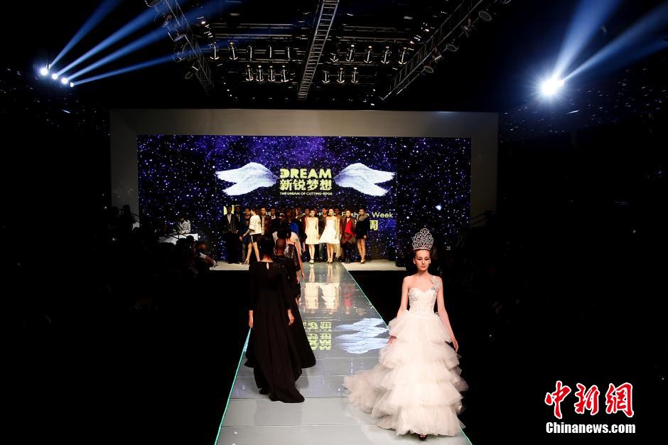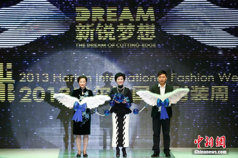 12月12日晚,“新锐梦想”2013哈尔滨国际时装周在哈尔滨红博西城红场开幕,本届时装周开幕以“设计师牵手创业女性结对”仪式开场,由市妇联主席杨杰、秀场汇·设计师集成网王天成、红博商业总经理王丽梅共同连结“梦想之翼”。中新社发 盛佳鹏 摄