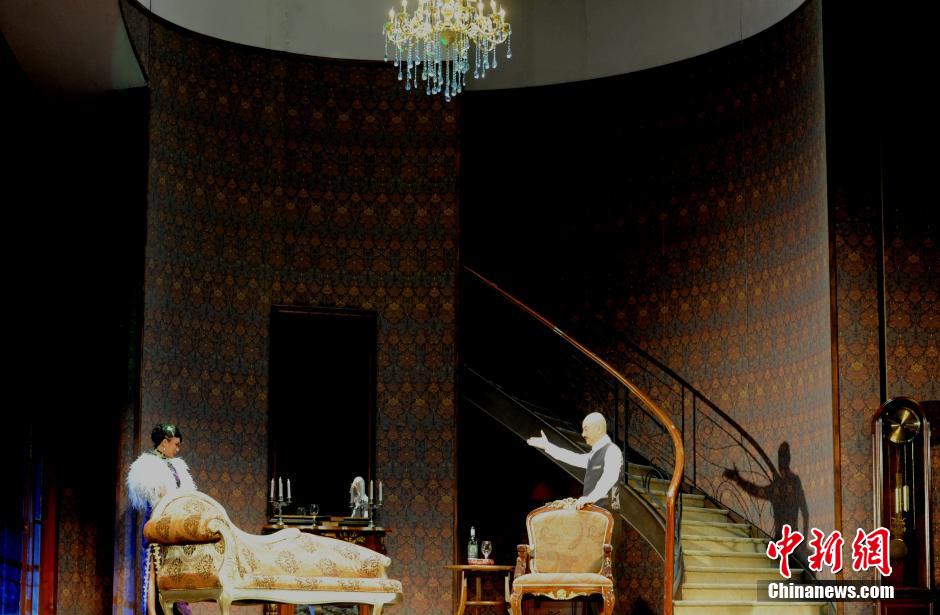 12月15日晚,由著名现代舞蹈家金星,京剧表演艺术家、海派清口创始人关栋天联袂“跨界”主演的话剧《暧昧》在福建大剧院上演。刘可耕 摄