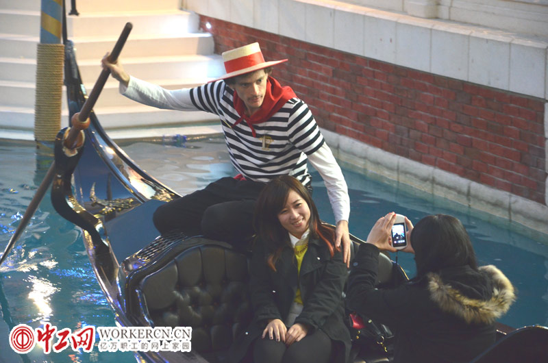 12月7日,澳门威尼斯人酒店享有意大利特色的贡多拉船夫在与游客合影。 (中工网记者 笑语摄)