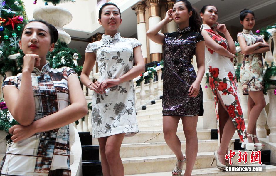 12月18日,正在四川成都参加2013世界休闲小姐大赛中国赛区总决赛的佳丽,身着不同款式风格的旗袍晚装进行展示、演绎。中新社发 钱兴强 摄