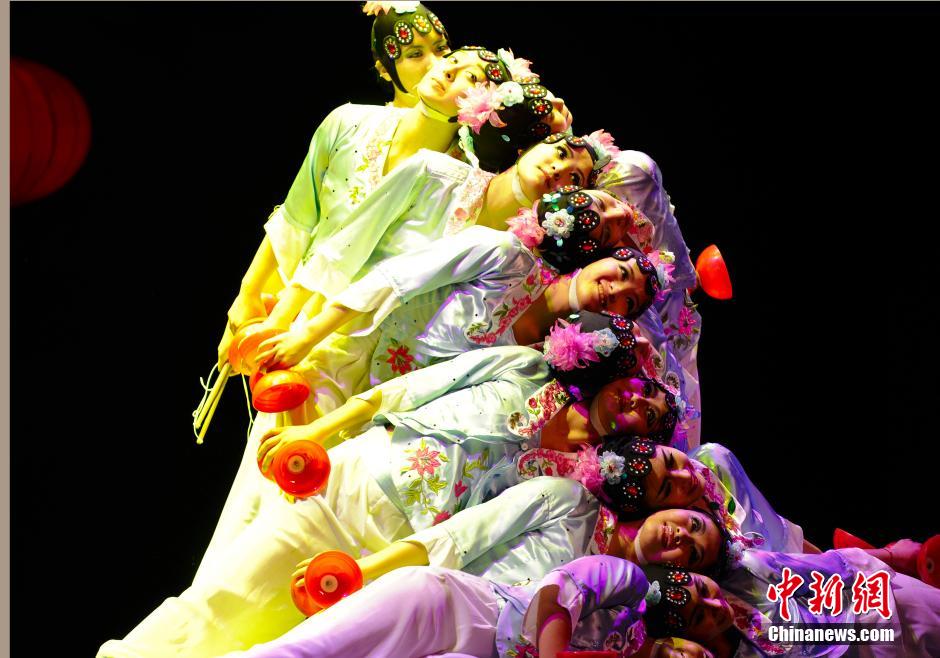 当地时间12月22日晚,中国大连杂技团演员们在美国硅谷佛林特中心表演杂技版《胡桃夹子》,该剧创作于2008年,改编自传统芭蕾舞剧。图为演员们表演抖空竹。中新社发 陈钢 摄