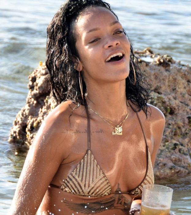难得清闲的蕾哈娜近日现身海滩,身着比基尼秀纹身,肥臀肉乳性感诱人。