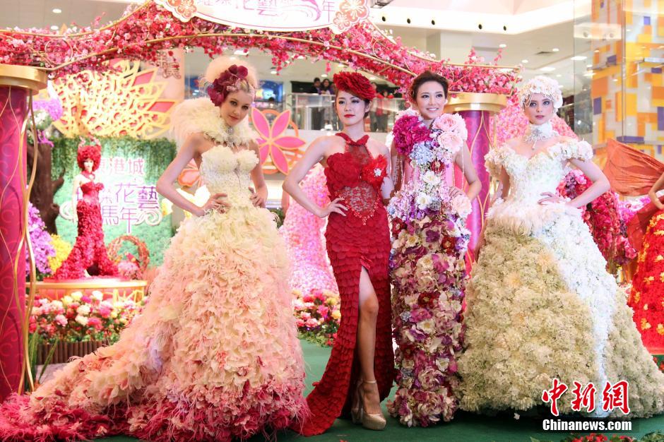 1月12日,香港东港城精心打造的“璀璨花艺迎马年”揭幕,以逾八万朵新鲜兰花及手工艺丝花精心布置的新春御花园,与市民共迎农历新年。当天,城中名模松岗李娜、倪晨曦等登场,演绎泰国花艺大师Pitag Hangsajara的花艺时装作品。中新社发 洪少葵 摄