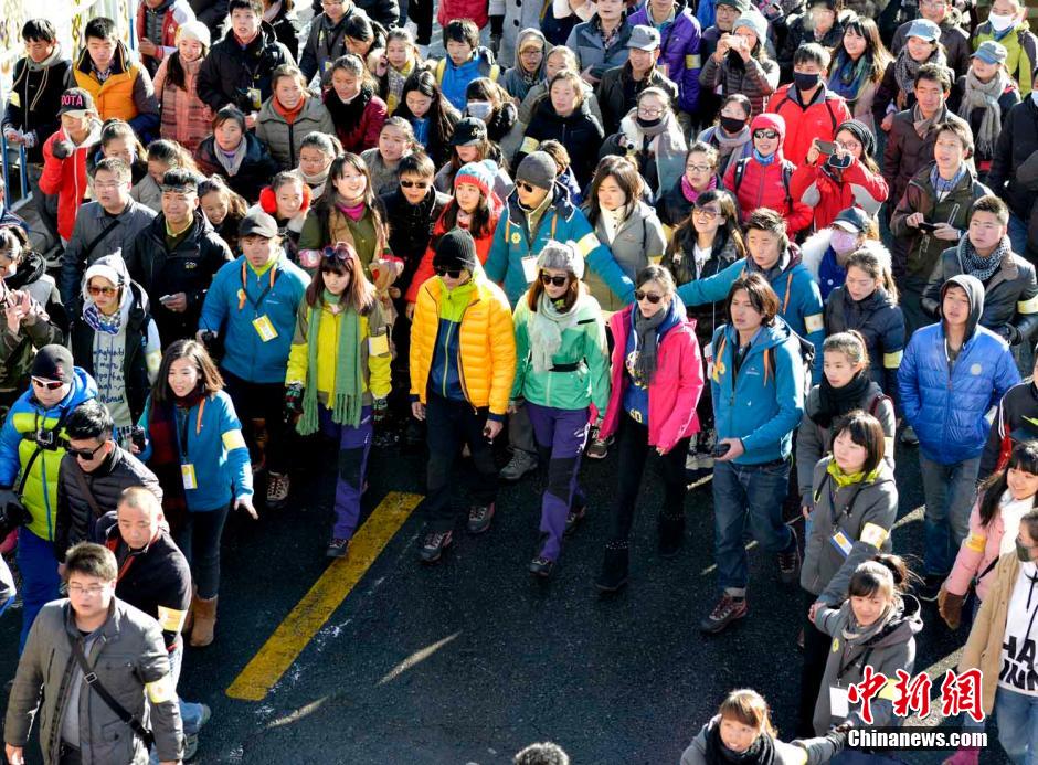 图为1月12日,参加活动的陈坤、张静初、王珞丹、经纬走在参加活动的人群中。李林 摄