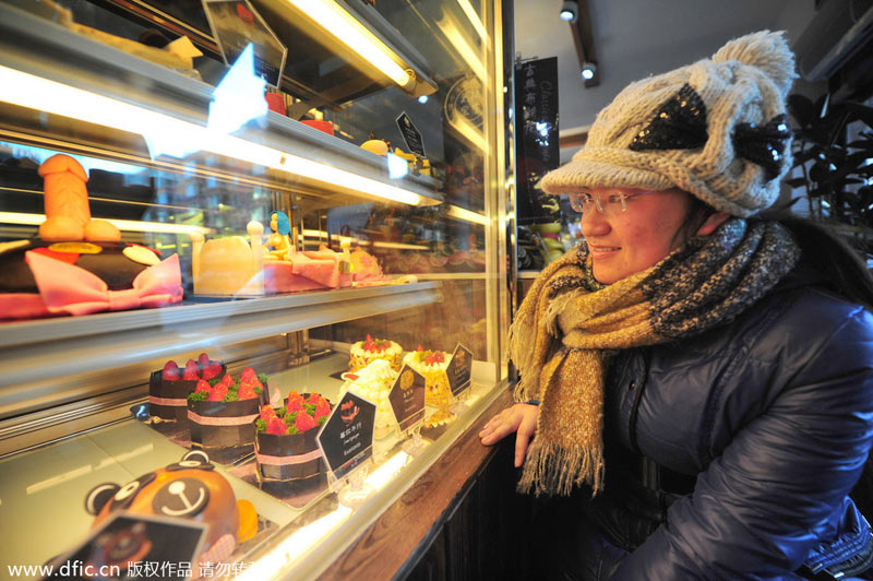 2014年1月8日,沈阳,顾客在展示她的创意巧克力蛋糕。30岁的张伟是沈阳一家A+乐滋蛋糕店的老板。现在很多蛋糕店太过常规化,为了凸显特色,有创意的东西一定会吸引消费者。所以,决定开一家主营顾客创意的蛋糕店。创意巧克力蛋糕店吸引了众多年轻消费群体的喜爱,顾客只要拿着想要制作的图案就可以在3小时内领取蛋糕。