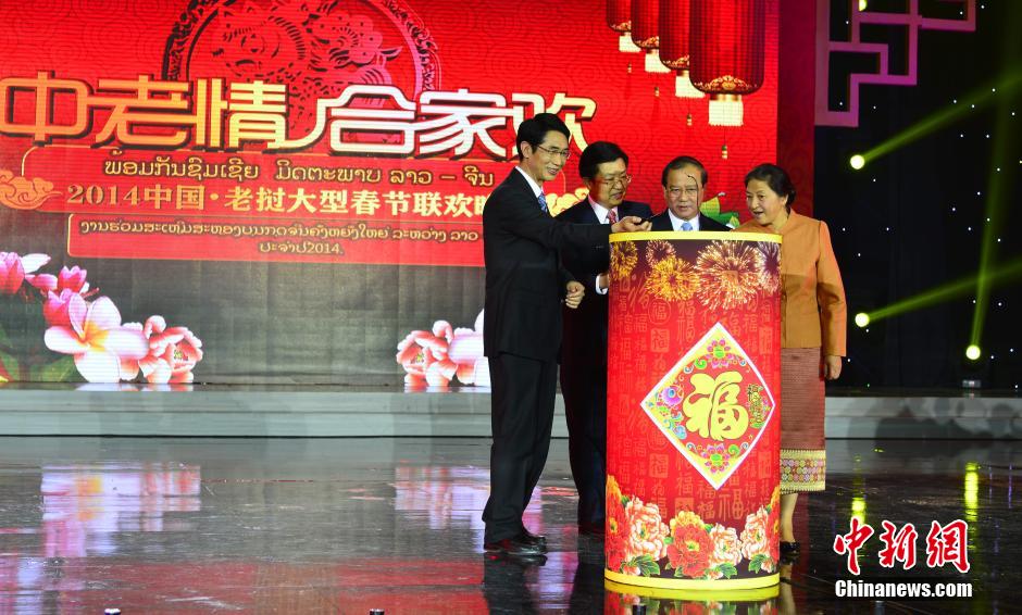 1月25日晚间,“中老情·合家欢——2014年春节联欢晚会”在老挝首都万象举行。此次晚会旨在以艺术为交通工具,进一步加深两国合作,传承两国人民“心连心”的友谊。图为中老双方代表启动晚会。中新社发 范光宇 摄