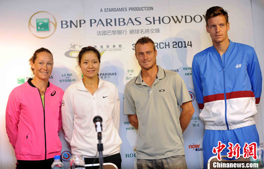 3月3日,网球名将施杜素、李娜、晓域及贝迪治(左起)亮相记者会。中新社发 谭达明 摄