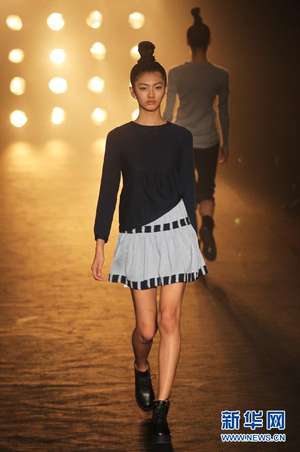 模特在展示设计师潘怡良设计的时装。当日,中国国际时装周“华孚·潘怡良色纺时尚发布会”在北京举行。