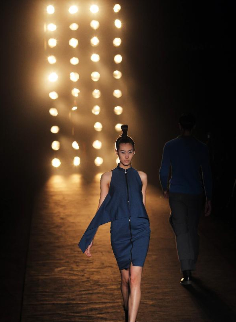 模特在展示设计师潘怡良设计的时装。当日,中国国际时装周“华孚·潘怡良色纺时尚发布会”在北京举行。 新