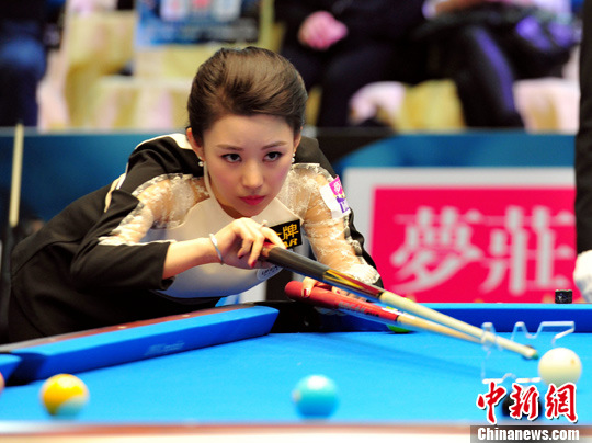 3月23日,中国“九球天后”潘晓婷在会内赛首日迎战韩国名将金佳映,最终以4:7不敌对手,图为潘晓婷在比赛中。中新社发 陈骥旻 摄