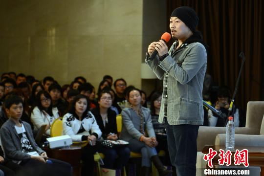 3月22日晚,华语乐坛作词人方文山身着朴素牛仔裤、深色的外套和针线帽,化身“烟雨过客”现身苏州,走进当地动听948“人文音乐课”,讲述流行歌曲“中国风”的概念、起始和发展。中新社发 王思哲 摄