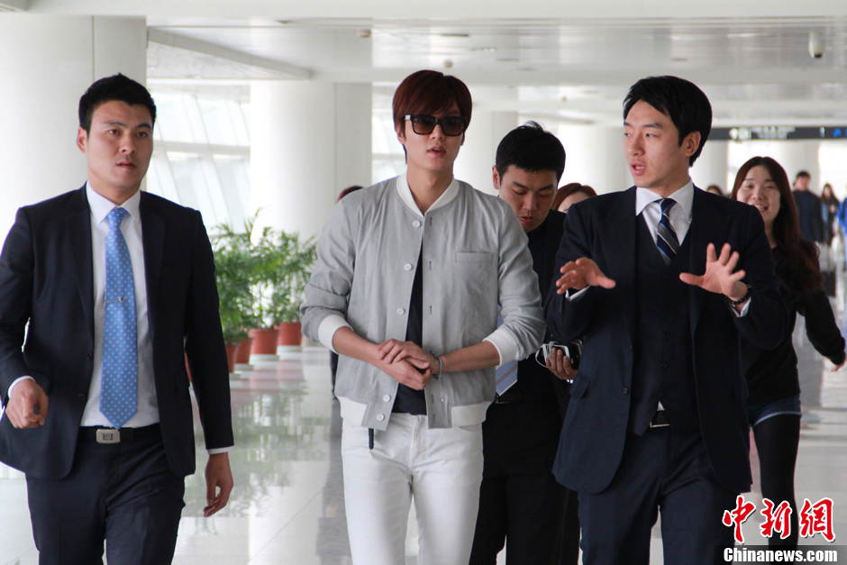 4月10日上午,韩国明星李敏镐经青岛机场入境抵达青岛出席商业活动,大量粉丝在青岛机场聚集迎接。中新社发 解豪 摄