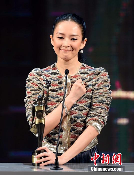 4月13日晚,第33届香港电影金像奖颁奖礼:章子怡继《2046》后,再凭《一代宗师》夺得金像奖最佳女主角。中新社发 张宇 摄