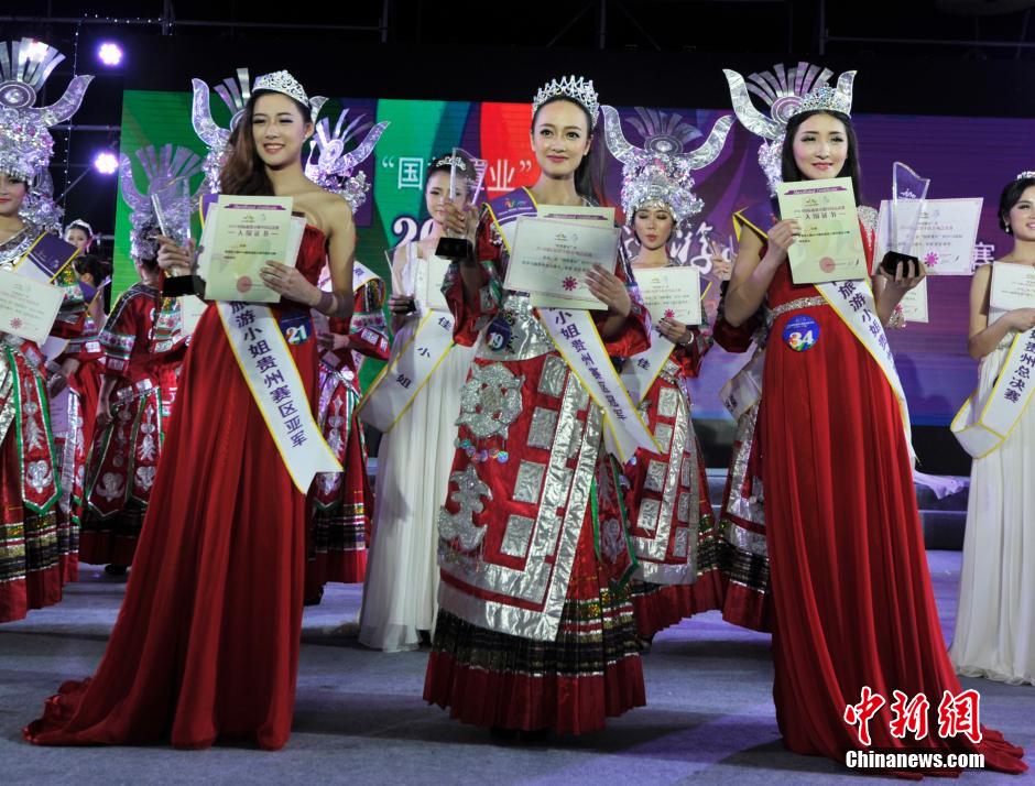 4月13日下午,在贵阳万丽酒店,“国旅置业杯”2014国际旅游小姐贵州总决赛圆满落幕。最终,来自山东的19号佳丽王思林一举夺冠,来自贵州铜仁的21佳丽古依荣获亚军,来自贵州的34号佳丽莫昱获得季军。图为往届国际旅游小姐国际冠军及获奖选手和本次获奖的三位佳丽合影。中新社发 李克 摄