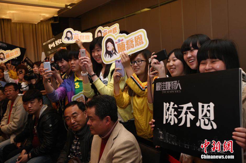 4月14日,2014年首部都市悬疑电影《最佳嫌疑人》第一场发布会在青岛举行,影片编剧兼导演张承、监制柯俊雄、主要演员陈乔恩、刘桦、矢野浩二亮相发布会,受到了青岛影迷的疯狂追捧。中新社发 徐崇德 摄