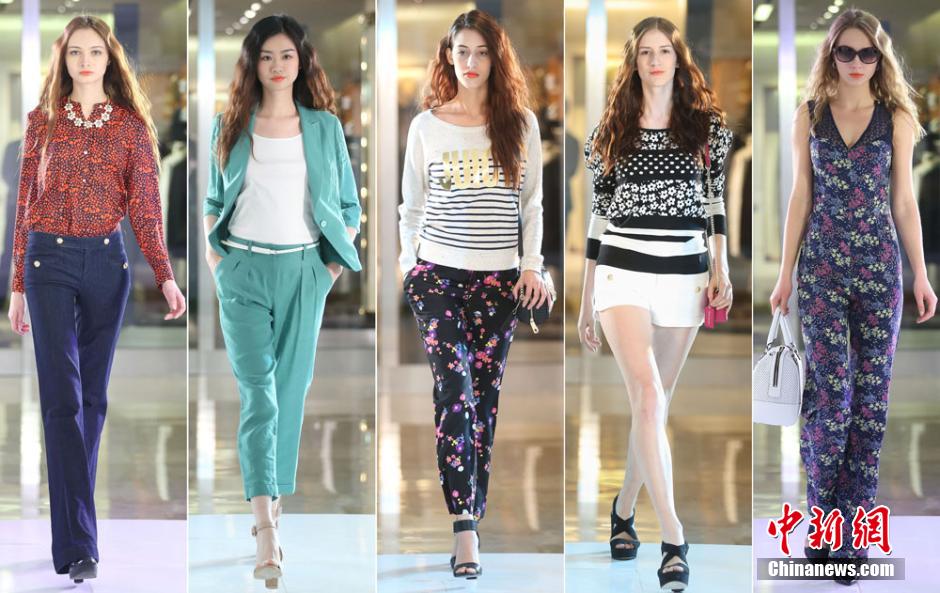 4月20日,靓丽的女模特展示春夏时尚女装。当日,为期一周的“旖旎之春”春夏秀场巡礼在南京德基广场完美谢幕,来自国外著名时装设计师带来的新款春夏时装在这个明媚的时节扑面而来,红蓝绿的活泼跳跃和黑灰的稳重大方拉开了春夏时尚的序幕。泱波 摄