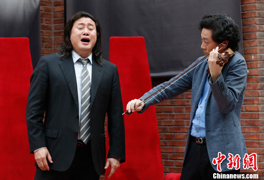4月22日,著名男高音歌唱家戴玉强(左)、著名小提琴家吕思清在北京召开发布会,宣布将于5月14晚在北京中山音乐堂联手为观众上演“弦歌双雄”音乐会。中新社发 杜洋 摄