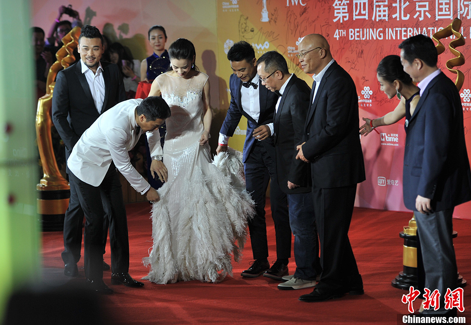 4月23日,第4届北京国际电影节举行闭幕红毯秀,章子台、吴君如、莫文蔚、甄子丹、黄圣依等群星云集。图为电影《冰封:重生之门》剧组亮相,甄子丹、黄圣依、任达华等现身红毯,甄子丹更绅士地为黄圣依打理裙子。中新网记者 金硕 摄