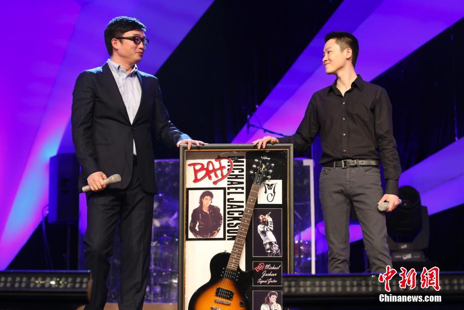 4月24日,少城时代董事长兼CEO冯柯(左)赠送梁博Michael Jackson签名吉他。当日下午,《中国好声音》第一季冠军梁博在北京举办首张创作大碟《梁博》暨2014“新的”演唱会记者会。中新社发 李慧思 摄