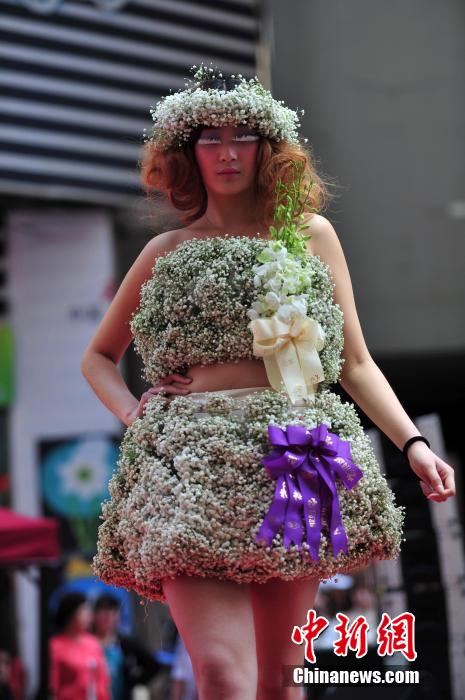 4月27日,身着鲜花搭配的婚纱走秀亮相沈阳街头,吸引了众多市民好奇的目光。中新社发 于海洋 摄